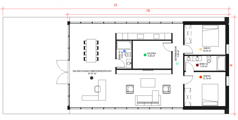 Vivienda singular y minimalista que se organiza entorno a un módulo central compuesto por un baño y una galería. En un espacio diáfano y con total visual del entorno, se encuentra la zona de estar-comedor y cocina.