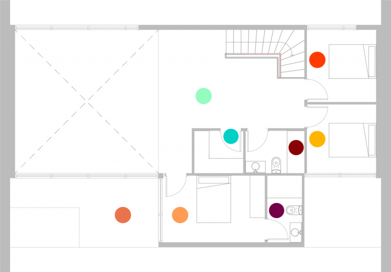 La gran escalera nos conduce a la segunda planta que se comunica con el salón a doble altura, zona más privada con 3 habitaciones y dos baños.