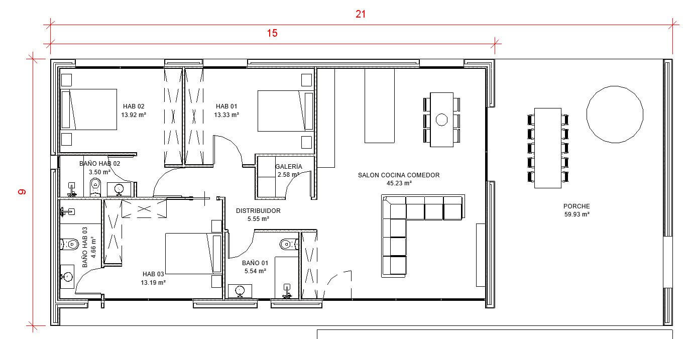 El porche cubierto actúa como acceso principal a la vivienda conectando el exterior con la gran estancia principal y zona de día: cocina, salón y comedor unidos de manera diáfana.