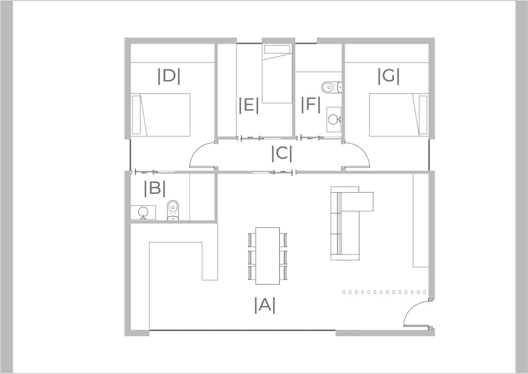Consta de una cocina, salón, comedor y dos dormitorios que giran en torno a un cubo central donde podemos encontrar un baño y un aseo entre otras dependencias.